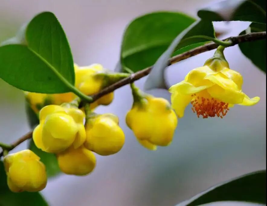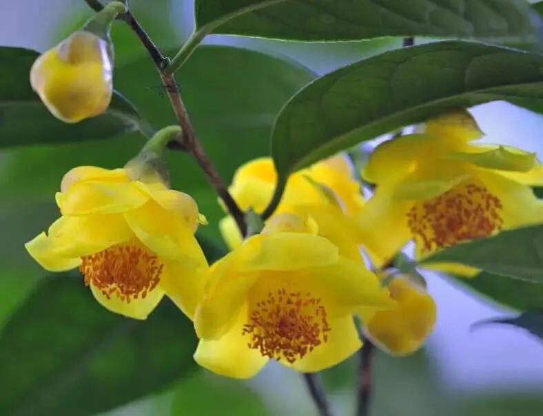 金花茶属于山茶科、山茶属,与茶、山茶、南山茶、油茶、茶梅等为孪生姐妹。金花茶嫩枝无毛,叶革质,长圆形或披针形,或倒披针形,先端尾状渐尖,基部楔形,无毛,下面浅绿色,无毛,有黑腺点,边缘有细锯齿,无毛,性喜温暖湿润气候,喜欢排水良好的酸性土壤。其主要分布于中国广西防城港市十万大山的兰山支脉一带。